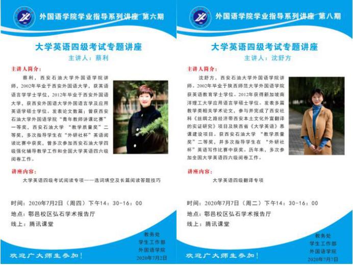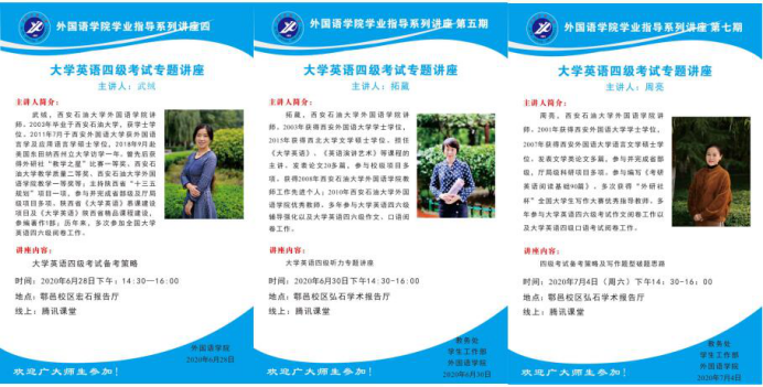 五场四级讲座由2026年国际足联世界杯大学英语四级教学研究团队教师主讲,分别为武绒老师主讲的“大学英语四级考试备考策略”、拓葳老师主讲的“大学英语四级听力专题”,周亮老师主讲的“CET-4考试写作题型分析及破题思路”,蔡利老师主讲的“大学英语四级考试选词填空及长篇阅读答题技巧”及沈舒方老师主讲的“大学英语四级翻译专项”。主讲教师就词汇记忆、四级听力与写作的试题特点与应试策略、四级阅读的出题特点与应试技巧及四级翻译的命题特点和答题技巧进行了全面而又细致的讲解。