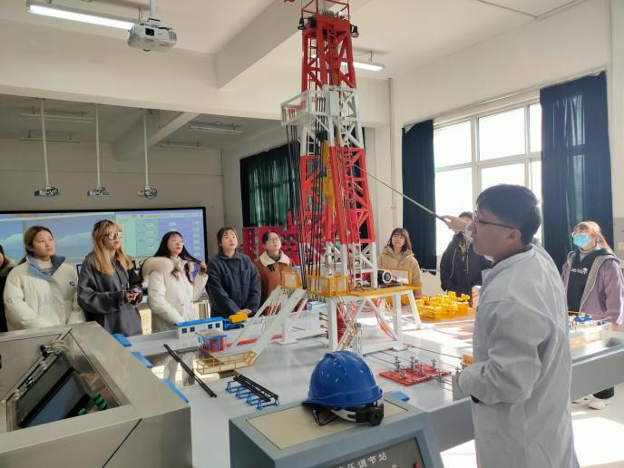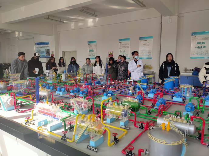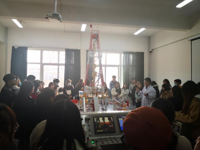 工程训练中心的张磊老师带领同学们先后参观了钻井、集输、采油、储运及油气田开发实训室,赵栋老师带领同学们分别参观了采油集输实训平台和地球科学科普教育地质实训平台。其中,地质实训平台陈列着许多矿物岩石信息,极大地丰富了野外实际地矿内容,而多技术的融合也极大地提升了同学们参观时的兴趣和热情。在参观过程中,同学们认真聆听老师的讲解、并结合自身感兴趣的问题向老师询问了油田勘探、开采、集输的相关知识。