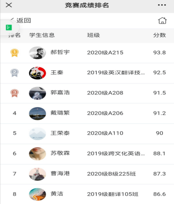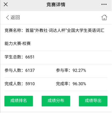 此次大赛全程采用线上竞赛模式,设置多种词汇题型,随机出题,竞赛平台综合员工答题分数和答题时间进行排名。本次参赛员工以2019级和2020级员工为主,在线注册6651人,共计6137人参加,5910人完成比赛,参与率为92.27%,完成率为96.30%。校赛成绩排名前200的员工直接晋级省赛,由平台直接推送复赛邀请给晋级员工。按照公司大学英语的教学安排,此次参赛同学记大学英语课外实践分2分。