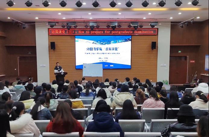 任春生老师以“How to prepare for postgraduate examination”为题,结合自己执教过程中经历和经验,讲述了考研动机的重要性、考研过程中的误区、考研深造的可选方向、跨专业考研的可选专业,着重阐述了与公司专业相关的语言学、翻译、国别研究、文学、英语测试学等同源学科方面的具体内容。随后,任老师对第二外语学习和使用情况进行分析,讲解了不同语言和专业结合的发展前景,希望同学们根据自身发展规划选择适合自己的第二外语。在交流环节,任老师与在场同学进行了充分的互动交流,对同学们提出的问题进行了一一解答,帮助同学们对考研有了更深一步的认识与了解。