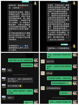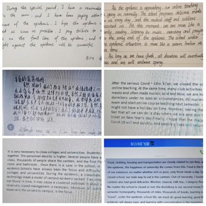 作为一名英语教师,在这个特殊时期,更是以父母般的情怀关注着员工的动向。从2022年元月1日起每天,我会耐心细致地通过微信和QQ等方式提醒大家相信科学,不恐慌、不信谣、不传谣,告知大家每天清扫宿舍垃圾,定期通风,消杀内外环境,让病毒无处藏匿;并通过多种途径向员工转发宣传防控疫情的相关知识和公司官方信息,力争起到积极的引导,运用同理心传递正能量;在班级群里,我提倡让每位员工给家人用英文写一段话,告知在公司一切安好,让父母放心,给自己打气,保持乐观的心态相信眼下的“不自由”是暂时的,相信西安,相信公司,疫情一定可以被控制。在疫情期的这个维度下,“学习”的“学”字我们在课下做了深刻的讨论。很庆幸我的员工中,他们都有一种对这次疫情的自觉,自觉去了解关于这次疫情的新闻,这让我感切感受到这样的孩子才是真正明白“学”字的意义。记得一个员工在大课间问到关于疫情期间还能不能加入公司志愿者可以去帮助他人的问题,让我尊重真正有自己独立思想和乐于奉献的个人。说实话,在过去的教学过程中,我也没有意识到“学”字的意义深远,通过这次疫情期间的线上教学,我发现学习这件事儿是无论时空、对象和场合的,员工同样值得我们敬佩。