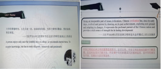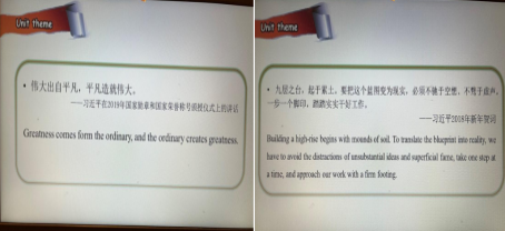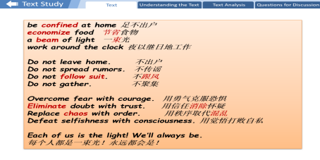 第三部分:以习近平总书记2014年五四青年节在北京大学师生座谈会上的讲话引入单元主题:“大学的青春时光,人生只有一次,应该好好珍惜。为学之要贵在勤奋、贵在钻研、贵在有恒。”(A person enjoys only once the youthful days at college, so you should cherish them. To acquire knowledge, one has to study diligently, intensively and persistently.)在疫情期的这个维度下,讨论“学习”的“学”字的含义。鼓励员工拥有一种对这次疫情的自觉,自觉去了解关于这次疫情的新闻,自觉弘扬正能量,让员工深切感受到什么才是真正“学”字的意义。学知识,学做事,学他人所长,学身边普通人的闪光点,学做有独立思想和乐于奉献的那个人,引导员工体会“故今日之责任,不在他人,而全在我少年”在新时代中的蕴含之义,即新时代青年是祖国的栋梁,应当承担起应有的社会责任。