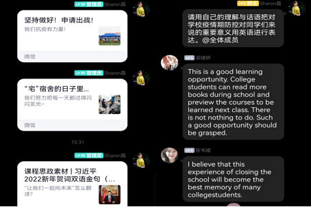 张磊老师主讲大学英语课程,结合单元话题“An impressive English Lesson”(一堂难忘的英语课)和主题“teach”(教)与“learn”(学),有条理地引导同学们积极端正学习态度,在疫情这个特殊时期能够有所学,有所进步。鼓励同学们在疫情当前这场没有硝烟的战争中,学习并体会逆行而上的中国精神和无坚不摧的中国力量;分享公司党员志愿者、医护志愿者迎难而上,照亮公司抗疫之路的感人事迹,学习他们勇于担当社会责任的奉献精神,树立正确的价值观人生观,增强民族自豪感,让同学们懂得何为“胸有大志,心有大我,肩有大任,行有大德”的中国力量,鼓舞大家士气,启发员工思考在当前的疫情状况下要始终坚信:我们一定能打赢这场疫情防控阻击战。