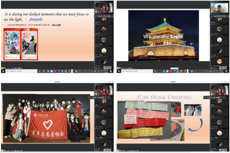 1)第一小节课开始阶段,员工以Be the Light为题,在口语展示中分享观看西安交通大学张颖老师制作的正能量小视频The Light之后的感受,讲述自己的亲身经历或所见所闻,见证疫情中的中国力量,探讨如何在疫情中,乃至今后的人生中努力成为一束光,照亮别人也温暖自己。