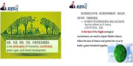 结合本单元主题“Living Green”,学习习近平总书记重要讲话中与生态文明,环境保护相关的金句。解析英文译文,积累词汇,增加词汇学习厚度,以思政素材赋能词汇学习;与此同时,帮助员工树立正确的生态观。