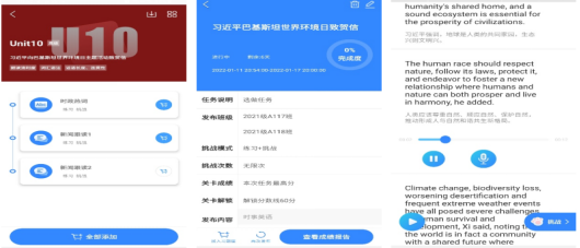 在FiF口语训练系统中布置了文段跟读任务“习近平总书记向巴基斯坦世界环境日活动致贺信”,让员工在练习语音语调的同时,巩固有关生态文明的词汇表达,深入了解中国生态文明建设的理念、策略、目标。
