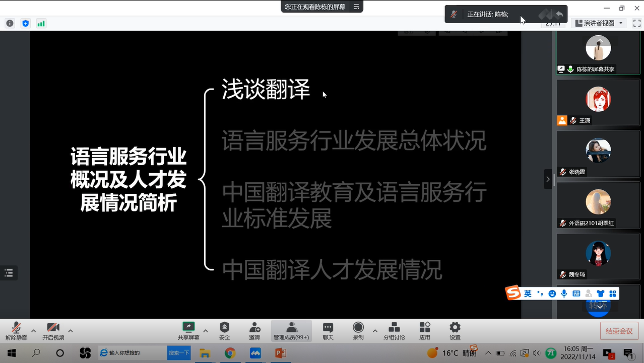 陈栋副总监从行业实践者的视角,向同学们普及了语言服务行业发展总体状况、当前中国翻译教育发展情况和语言服务行业的一些政策标准,介绍了不断完善的翻译人才评价体系以及语言服务行业从业人员的基本素养和基本要求,通过分析翻译专业人才的职业前景、成长路径和事业机会,帮助员工在语言服务行业做好职业规划。