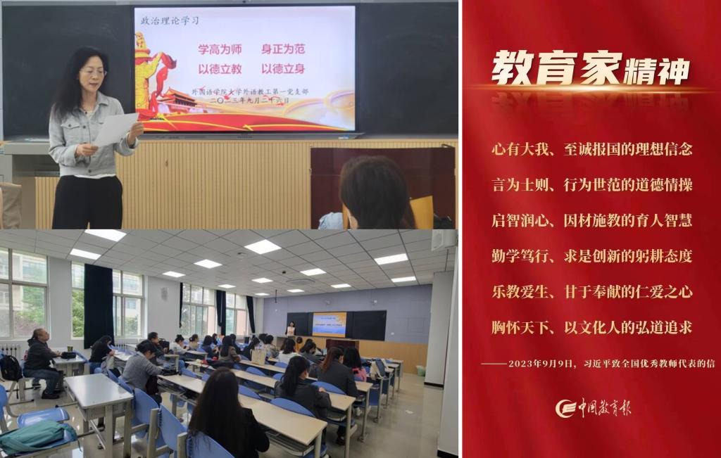 在政治理论学习扩大会上,付俊芳领学了习近平总书记教师节重要指示精神,她表示,作为新时代的高等教育工作者,我们要深刻理解习近平总书记在2023年9月9日致全国优秀教师代表的信中提出的“心有大我、至诚报国的理想信念,言为士则、行为世范的道德情操,启智润心、因材施教的育人智慧,勤学笃行、求是创新的躬耕态度,乐教爱生、甘于奉献的仁爱之心,胸怀天下、以文化人的弘道追求”教育家精神的科学内涵和内在逻辑,牢记为党育人、为国育才的初心使命,把师德师风建设摆在首要位置,不仅要在教学中为员工传授知识,更要通过自己的言行举止为员工树立正面榜样,以赤诚之心、奉献之心、仁爱之心投身大学英语教育事业。葛丽领学了“学高为师身正为范以德立教以德立身”相关教育内容,她谈到,习近平总书记强调:师德是深厚的知识修养和文化品位的体现。师德需要教育培养,更需要老师自我修养。做一个高尚的人、纯粹的人、脱离了低级趣味的人,应该是每一个老师的不懈追求和行为常态。