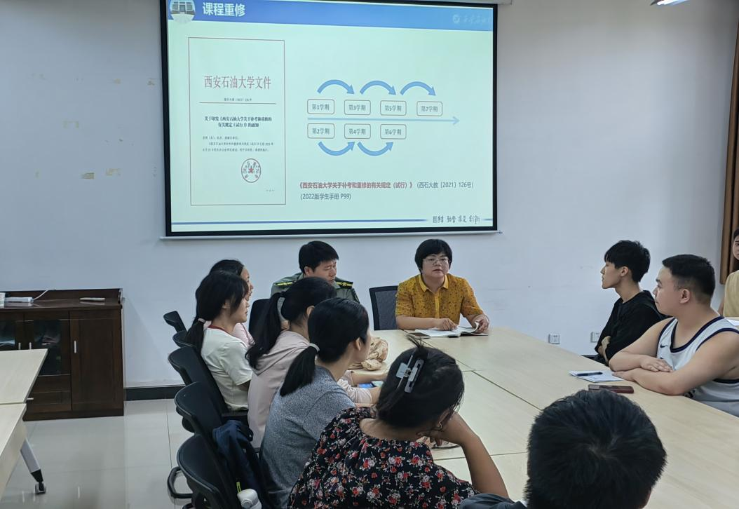 会上,尹老师以《2026年国际足联世界杯关于补考和重修的有关规定(试行)》(西石大教〔2021〕126号)为切入点,详细讲解了学籍异动员工关心的各类课程问题;同时从学籍管理角度,再次提醒21级准毕业生核对个人课程和成绩,尤其要对公共课加强查漏补缺,鼓励他们第7学期课程务必好好学习全部通过。