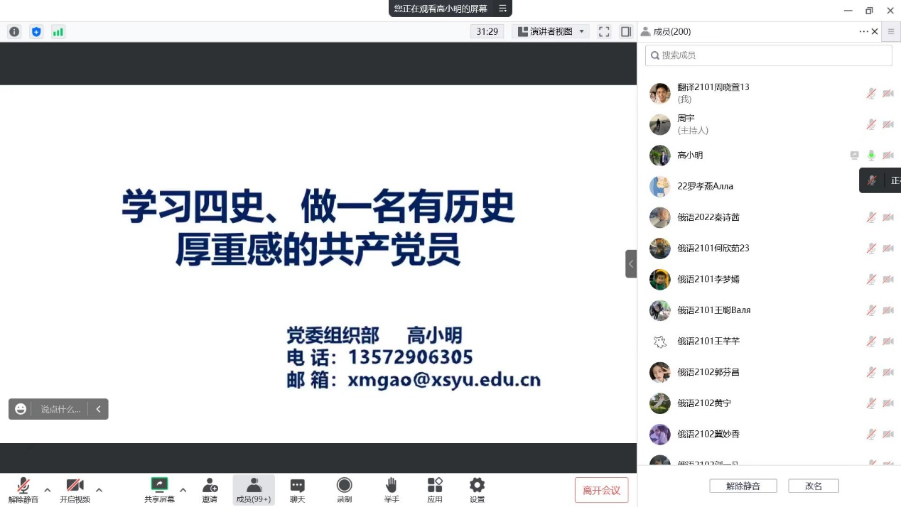 高老师以“学习四史、做一名有历史厚重感的共产党员”为主题,以世界经济千年史、不同时期中国国内生产总值占世界生产总值的比重、党领导下的中国国内生产总值增速与其他国家增速的比较为引,并结合党的历次全国代表大会召开情况,围绕“为什么学习‘四史’、‘四史’学什么、如何做一名有历史厚重感的党员”三个方面,对“四史”教育的意义、“四史”学习重要性、“四史”学习内容和为什么入党要宣誓等进行了详细讲解。
