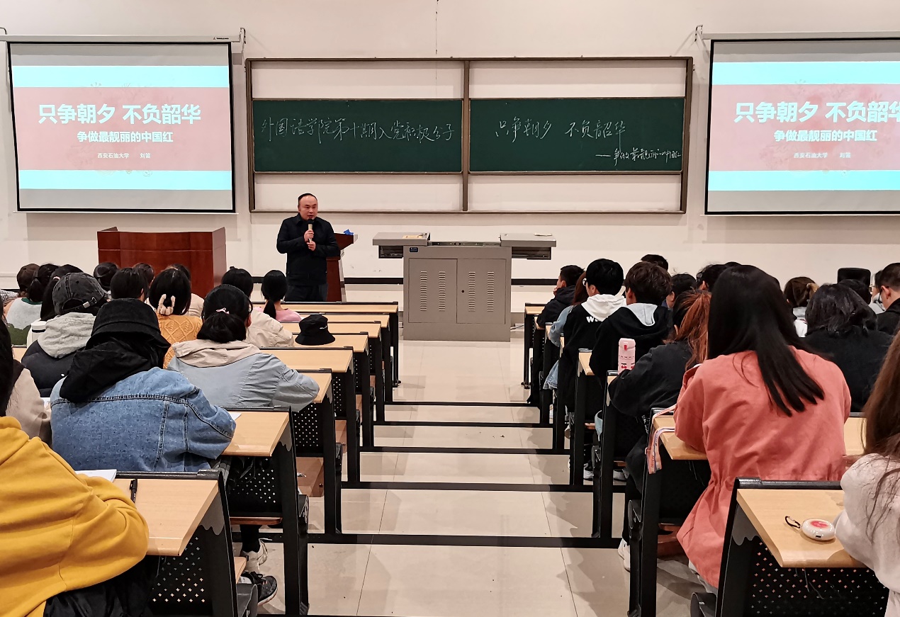 刘笛副部长以 “只争朝夕、不负韶华——争做最靓丽的中国红”为题,围绕习近平总书记重要讲话精神和重要回信精神,结合自己多年员工工作经验和工作实际,从“学思想、端动机,勤思考、善学习,提格局、勇担当,有情怀、立大志”四个方面进行讲授。他强调,大家要端正入党动机,树立正确的世界观、人生观、价值观,坚持为同学服务、为班级做贡献、为公司争荣誉、为国家富强而努力、为中华崛起而读书;要以英语、翻译和俄语的专业培养要求为纲,不断提升自己的专业能力、学业水平,切实成为国家需要的外语人才;要以党员的标准要求来要求自己,学好本领,勇担历史使命,发挥模范带头作用。并对全体学员提出了四点希望,一是要陶冶情操,勤学修德;求真向善,诚信友爱。二是要主动学习,勤学善思;创新学习,积极实践。三是要坚定信念,正确定位;不忘初心,勇担责任。四是要但行好事,初心莫忘;前途似海,未来可期。