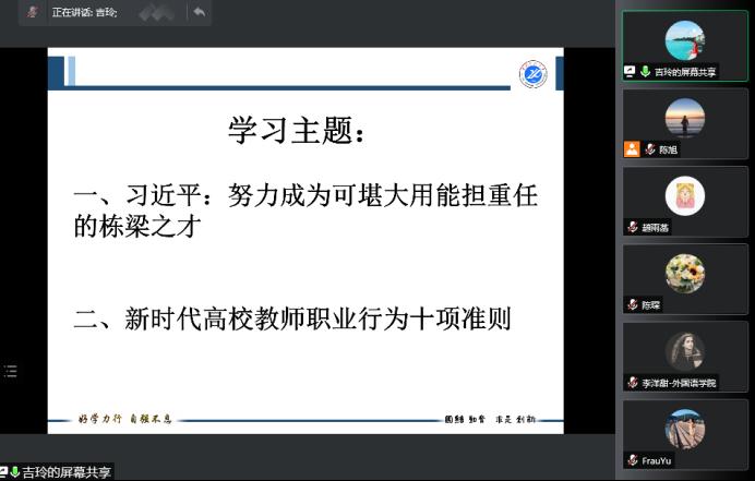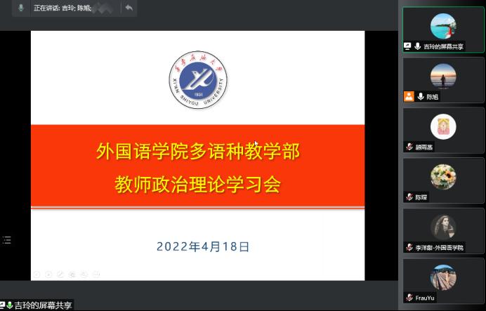 为提高系部教师的思想政治素质和师德修养水平,多语种教学部于4月18日通过腾讯会议召开了教师政治理论学习专题会。多语种教学部全体教师参会,会议由党支部书记吉玲主持。