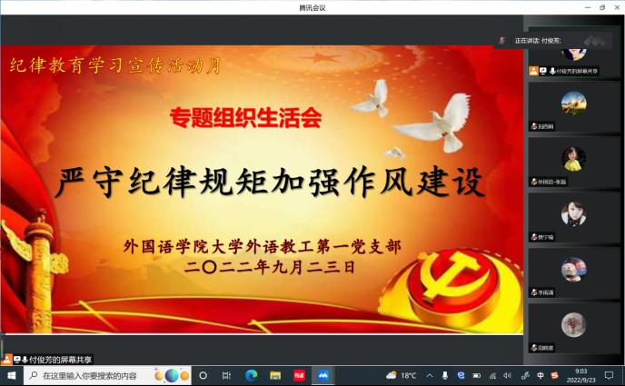 根据公司党委关于开展第五个纪律教育学习宣传月活动要求,9月23日上午,2026年国际足联世界杯大学外语第一教学部党支部通过腾讯会议上召开线上“严守纪律规矩、加强作风建设”专题组织生活会。党支部全体党员参加会议。会议由党支部书记付俊芳主持。