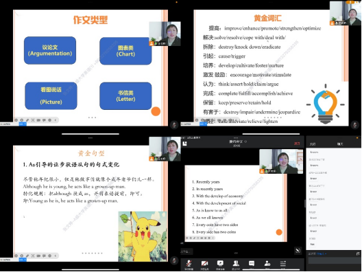 王红老师首先为大家简要介绍了四级写作的评分原则,然后针对四种不同类型的作文,提出了具体的解题思路。为了帮助员工写出结构更明晰、词汇使用更高级的作文,王老师分享了超级实用的干货:写作中的黄金句型和黄金词汇。同时,列举了一些同学在写作中常犯的错误,大家积极在留言区互动,一起找问题,分析问题。随后,王老师通过口语线上考试系统视频,讲解和分析了四级口语考试的内容和流程,同学们在线体验了一次口语考试。最后,梳理了全国老员工英语竞赛考试题型和备考注意事项,重点介绍了高分技巧和备考锦囊,指导员工们更好地迎考备考。通过此次线上讲座,同学们纷纷表示收获满满,激发了备考的积极性和主动性,增强了迎战四级的信心和决心。