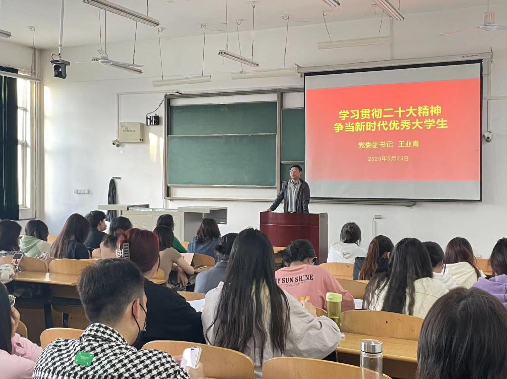 王业青聚焦学习贯彻党的二十大精神这一核心内容和主线,围绕二十大的相关内容,从大会主题、一个中心任务,“两步走”战略安排、三个“务必”、五个“必由之路”、六个“必须坚持”六方面深刻阐述了中国共产党的全面领导及其重要作用,并将报告中的重要思想和精神与同学们的大学学习紧密结合,帮助同学们更深入地感悟二十大精神,担当时代使命。在课堂上,王业青着重讲述了从十八大到二十大的十年里,我们经历的具有重大现实意义和深远历史意义的三件大事,一是迎来中国共产党成立一百周年,二是中国特色社会主义进入新时代,三是完成脱贫攻坚,实现第一个百年奋斗目标。从这三件大事,深刻领悟了中国共产党人的不懈努力和顽强拼搏,进一步体会到中国共产党带领全国人民朝着中华民族伟大复兴征程中的重要使命,加强了员工党员的理想信念。