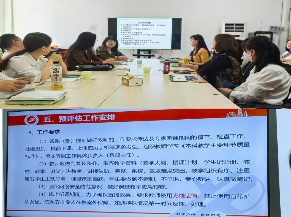 在教学工作会议环节,大学外语第一教学部主任李雪梅就近期教学工作及本科公司产品预评估和期中考试等工作作了详尽安排。李雪梅指出,本科教学评估有利于规范教学管理,提升教学质量,各位教师务必认真学习评估“应知应会”手册,严格遵守并执行各项教学规范和要求。