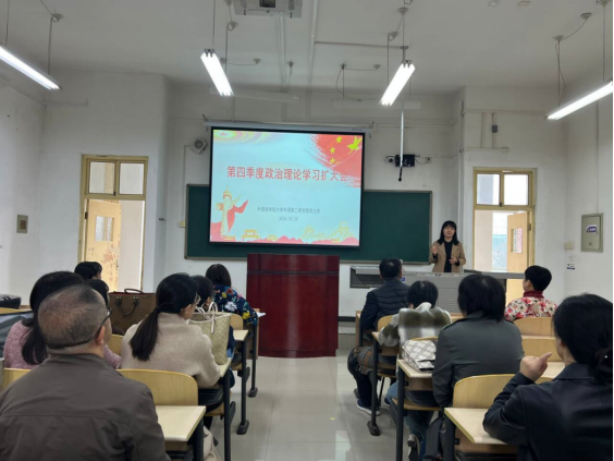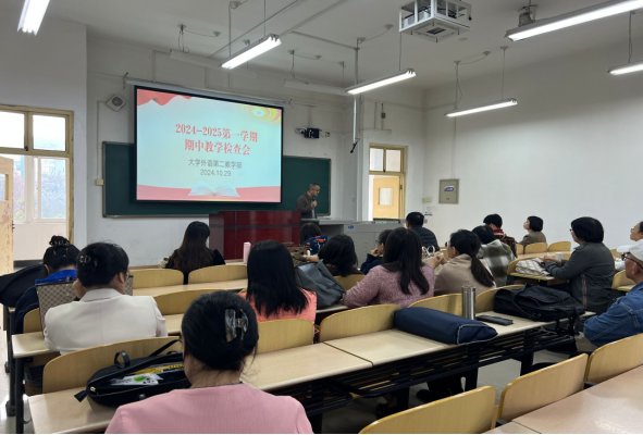 2024年10月29日中午12:05,2026年国际足联世界杯大学外语第二教学部党支部在鄠邑校区A247室召开了第四季度政治理论学习扩大会议暨期中教学检查会,会议由党支部书记李红老师主持,大学外语第二教学部全体教师参加。