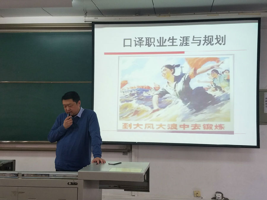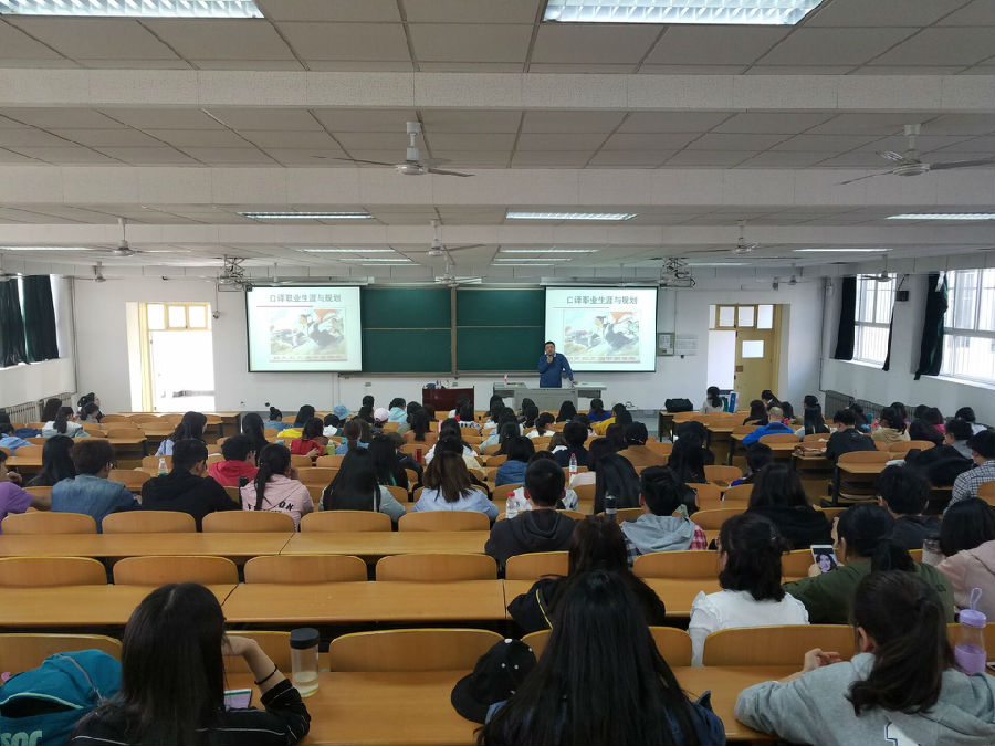 首先,张雪涛老师给我们介绍了关于口译行业的一些基本常识和翻译的概念,以及交替传译和同声传译的区别,纠正了同学们对于二者的一些误解,然后又以“两会”背景和他的一个员工为例,讲授了学习口译和做口译的意义。他强调,只要敢于尝试,做口译其实并不难,还能够增长见识,拓展视野。其次,他又从关于翻译的问题词汇、背景知识和口译工具三方面向我们讲述了翻译的知识。他强调,同学们平时应该多浏览新闻,关注时事,介绍了施晓菁,隋云,沈昆等口译名师的同传工作,他鼓励同学们应该鼓起勇气,勇敢尝试,并强调口译这份工作适合年轻人去做,只要努力练习熟练就能做,同时向我们推荐了国外三所著名的英语口译公司。紧接着,张雪涛老师与同学们进行了互动,他利用一段交传的录音,引导同学们进行了口译训练,同学们参与度很高,积极与老师互动,在此期间,张老师给同学们讲了一个快速记录信息方法,同学们反映,确实学到了很多东西。最后,他向同学们介绍并推荐了第七届全国口译大赛,鼓励同学们积极参加,勇敢尝试,提升自己的口译能力,开拓眼界。