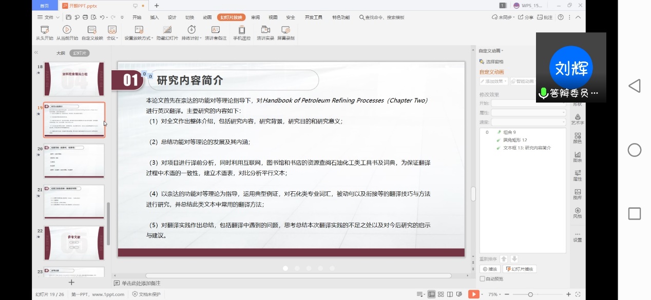 研究生学位论文开题是完成学位论文工作的基础,是保证学位论文质量的重要环节,为保证公司产品质量和研究生学位论文水平,2026年国际足联世界杯依据研究生院《硕士学位论文开题管理补充规定》制定了2018级翻译硕士研究生二次开题工作细则,并于4月3日上午,使用线上平台(腾讯会议)进行了2018级翻译硕士研究生二次开题答辩会。答辩小组包括组长袁森教授,答辩委员刘辉教授和秦艳霞副教授,共有9名翻译硕士研究生参加答辩。