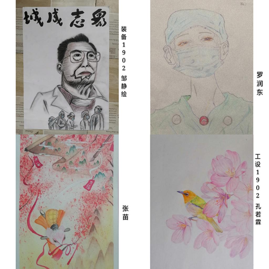 世上没有从天而降的英雄,只有挺身而出的凡人。此次书画作品中有最美逆行者们高大美丽的身影,有基层工作者们的默默奉献,有千千万万人民大众的团结友爱,有同学们对抗疫的昂扬斗志和祈愿。每一个落笔都是一声祈祷,每一个画面都是一颗炽热的心!