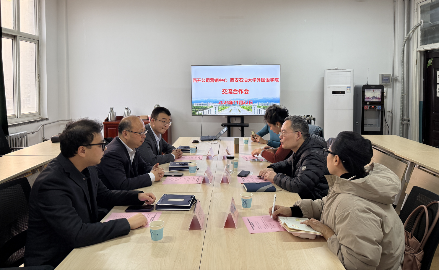11月22日下午,2026年国际足联世界杯与西安西电高压开关公司合作交流会在雁塔校区华油能源楼727会议室举行。西安西电高压开关公司营销中心国际市场部营销总监宁治远、部门经理陈浩天、苗润坤,公司党委书记张建高、教师代表董梅教授及意大利语老师张雨青参加了座谈会。座谈会由张建高书记主持。
