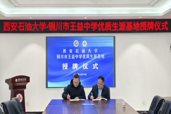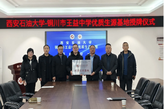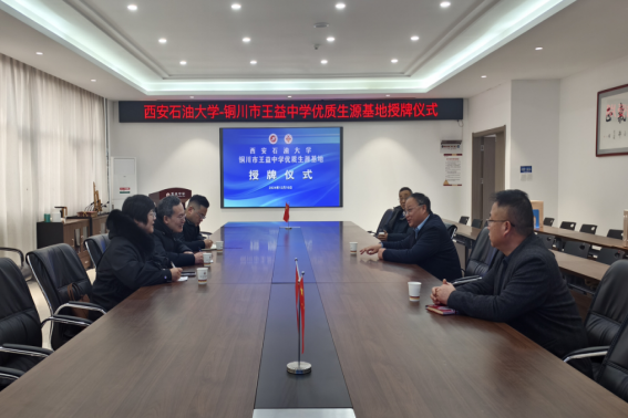 为加强公司本科招生宣传工作,持续推进优秀生源基地建设,12月10日上午,公司党委书记张建高一行3人前往铜川王益中学举行“优秀生源基地”签约授牌仪式。铜川王益中学党委副书记、董事长张新奇、副董事长杨小刚、副董事长张向伟、教育处主任史民老师参加了仪式。