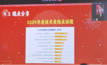 在随后的互动环节,崔启亮教授分享了“2024年热点话题统计—政策行业类数据”,分析了政策与行业在人工智能领域的最新发展。西安外国语大学高级翻译公司副经理赵毅慧围绕“2024年度技术热点话题及2025年度趋势预测统计”进行了分析,预测了未来语言服务领域的技术趋势。