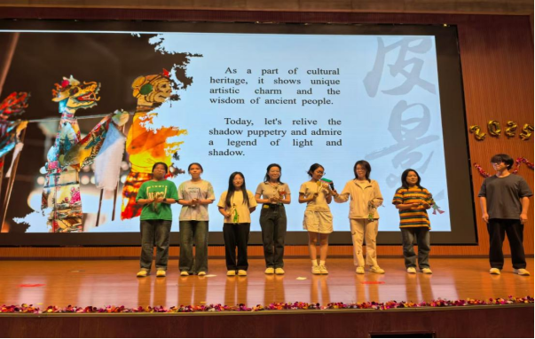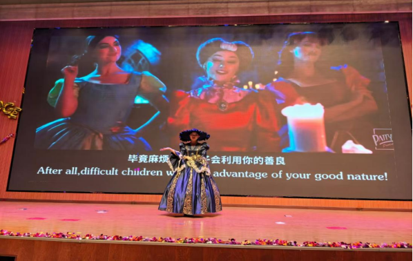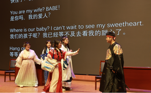学子们以英语为舟,破浪前行,整个舞台成为了文化交流的璀璨窗口。经济管理公司张云喆的深情独唱《Strawberries & Cigarettes》和电子工程公司马翔宇献唱的迪士尼经典《Reflection》尽显声音魅力;新能源公司史沐涵演绎的《Tough Love》更是将情感与语言技巧融为一体;计算机公司、地球科学与工程公司带来的《长发公主》《狗狗博客》及理公司呈现的《奇迹男孩》配音秀,精准捕捉角色神韵,展现了卓越的语音模仿与表达力;人文公司张艺菲与新能源公司高天乐等联袂献演的传统《嫦娥奔月》皮影戏,光影流转间流淌着东方神韵;石油工程公司施澜、李熠辉创新的《传说中的英语相声》,妙语连珠中架起中西幽默的桥梁;人文公司学子演绎的《武林外传》情景剧,则为经典注入国际化表达。歌曲串烧由来自石工、经管、电工、地科、计算机、材料、人文、化工、理公司、新能源、机械等11个公司的近100名学子共同完成,《Take me home》《Country Road》经典旋律响彻全场,气势恢宏,综合性大学的育人优势在此刻熠熠生辉。从台前的演员阵容到幕后的技术支撑,处处可见各个公司广泛参与的身影,每一个环节的紧密衔接,都是跨公司团队协作精神的胜利。