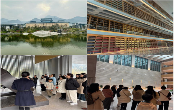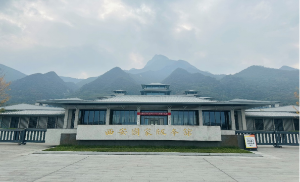 秦岭北麓,圭峰叠翠,西安国家版本馆作为中国国家版本馆 “一总三分” 的重要组成部分,以 “山水相融、天人合一、汉唐气象、中国精神” 的设计理念,成为承载中华文化基因的 “文明殿堂”。党员们怀着崇敬之心拾级而上,首先参观了馆内序厅及园林区域,90米长的巨型通顶书墙陈列着5万册精品图书,与从太平峪引入的文济泉、文济池相映成趣,让大家在感受建筑艺术之美的同时,深切体会到“藏之名山、传之后世”的文化担当。