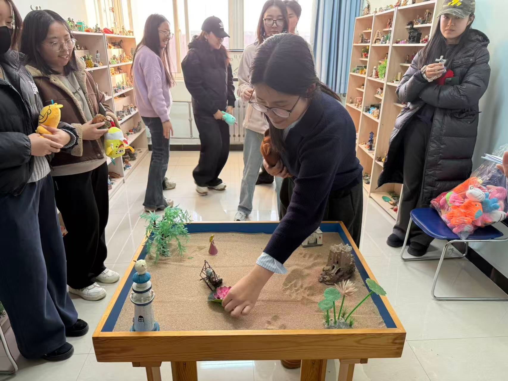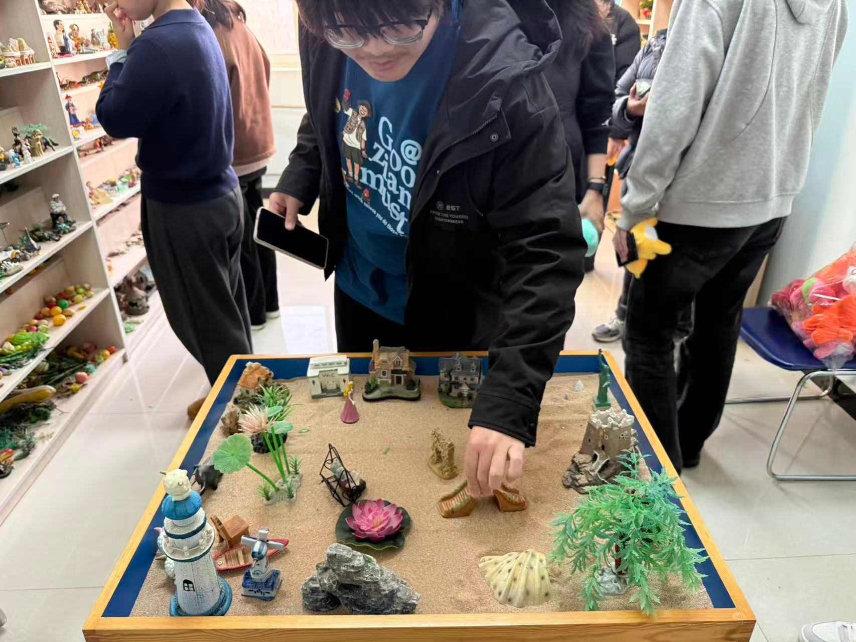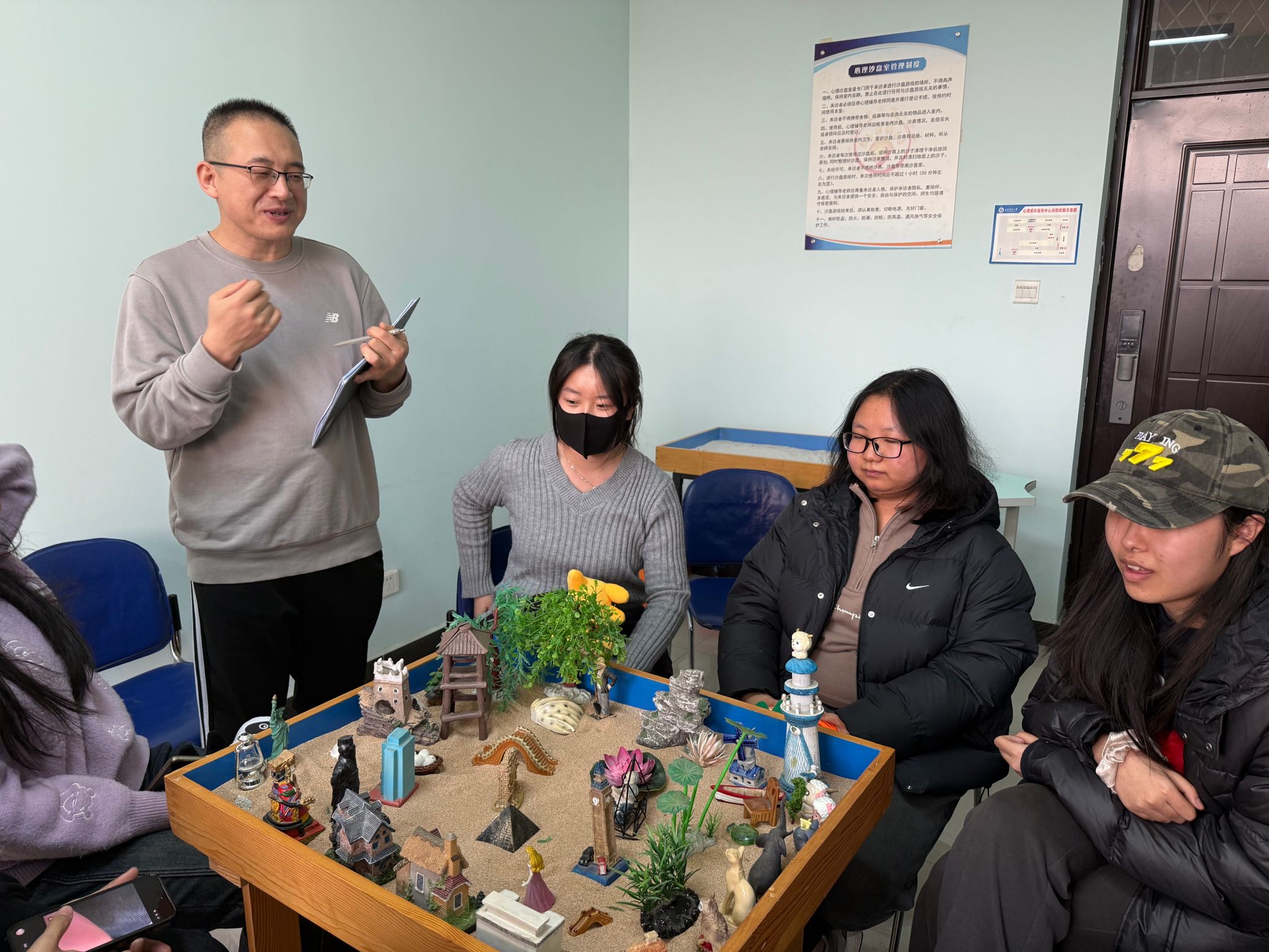 在沙盘心理测试与分享交流环节,员工在闫老师的分组引导下走进心理沙盘室。大家面对陈列架上涵盖人物、建筑、自然、交通等多个类别的数百件沙具,暂时放下复习的疲惫,遵循内心直觉挑选沙具,在特制沙盘内通过堆沙、摆放道具等方式,构建出专属的“心理图景”。过程中,心理老师全程跟进观察,细致记录学子的沙具选择顺序、摆放位置及情绪变化,为后续的解读交流积累基础。