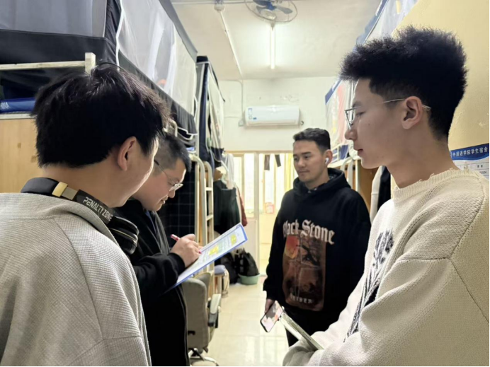 共建文明宿舍,营造安全小家。宿舍是员工生活的重要场所,也是安全管理重点区域。12月8日下午,辅导员对宿舍进行了走访和检查,着重排查了违规电器、存放易燃易品等安全隐患,提醒员工要做到人走断电、锁好门窗,切实防火防盗等安全隐患,督促员工即查即改。通过排查,引导员工遵守管理规定,将安全教育融入日常,共创安全、温馨居住环境。