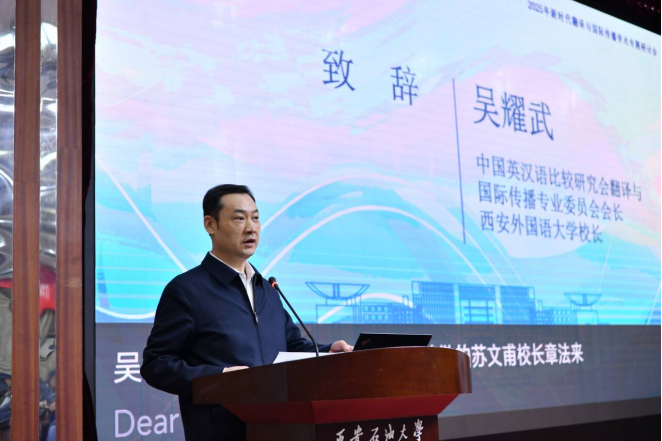 开幕式上,中国英汉语比较研究会翻译与国际传播专业委员会会长、西安外国语大学董事长吴耀武致辞。吴耀武指出,新时代外语人应深刻认识百年未有之大变局所赋予的时代使命,勇于担当,以精准的话语讲述中国故事、阐释中国理念,推动科技成果与人文智慧更好地走向世界。面对人工智能浪潮,我们应主动推进科技与人文协同,赋能外语学科高质量发展,促进二者同频共振。同时,必须审慎思考并积极应对翻译技术带来的伦理挑战、译者主体性重构以及信息公信力等重大问题。他呼吁,应进一步加强跨学科协作,打破学术壁垒,深化语言学、传播学与计算机科学的交叉融合,共同培养面向未来的复合型国际传播人才。